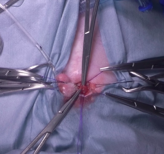 糸で膀胱と腹壁を固定します。これは、膀胱内容物が腹腔へ漏れないようにするためと、膀胱内の結石をとる作業中に膀胱が腹腔内に戻ってしまうのを防ぐために行います。