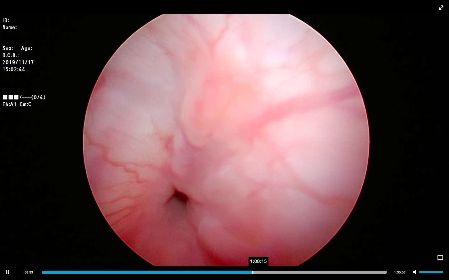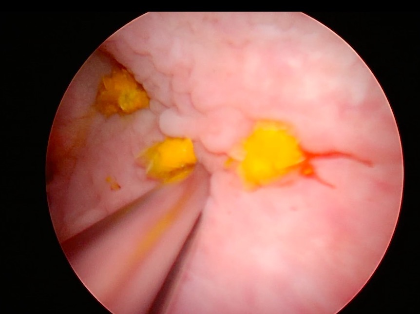 生理食塩水を尿道カテーテルから入れていき、ある程度の膀胱の張りを保ちつつ、鉗子やサクションを用いて膀胱結石を摘出していきます。最後に膀胱内をカメラでチェックし、尿道カテーテルを抜去していきながら尿道へカメラを進めていき、