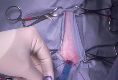 膀胱が明らかになれば、鉗子で膀胱をつまみそのまま開けた穴から体腔外へ少し引き出します。