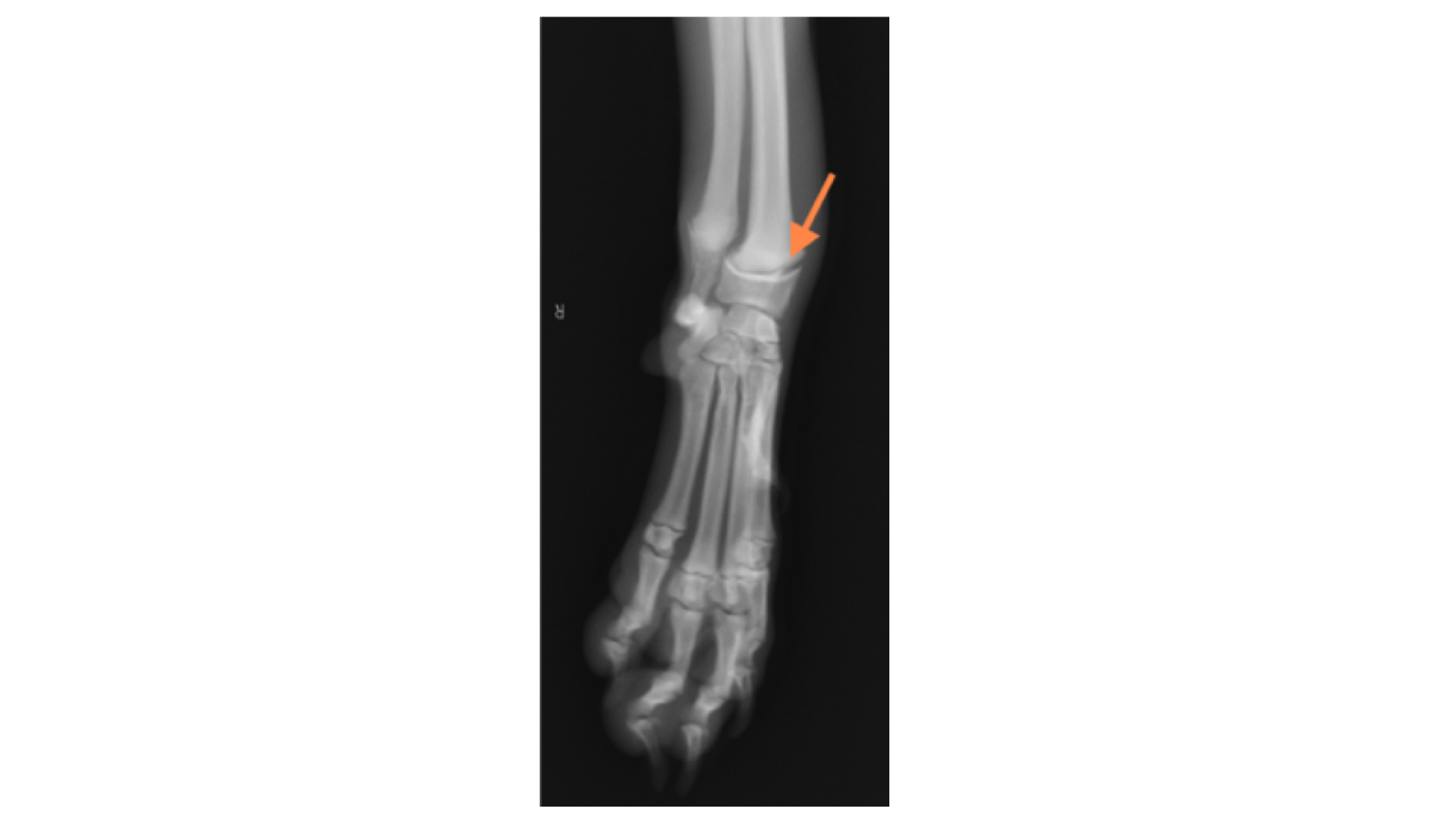 レントゲン検査を行ったところ、右手根骨のⅠ型成長板骨折が認められました。