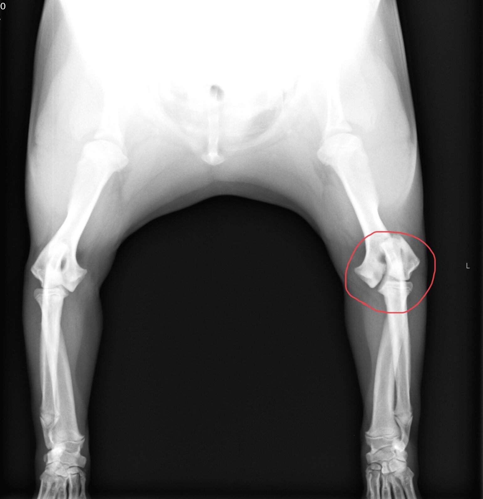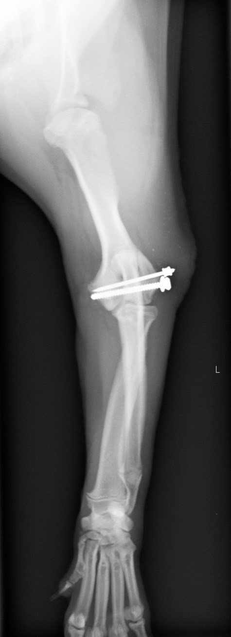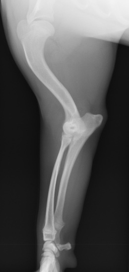 来院時も左前肢を挙上した状態で、左の肘あたりを触ると軽度の骨の動揺が認められました。