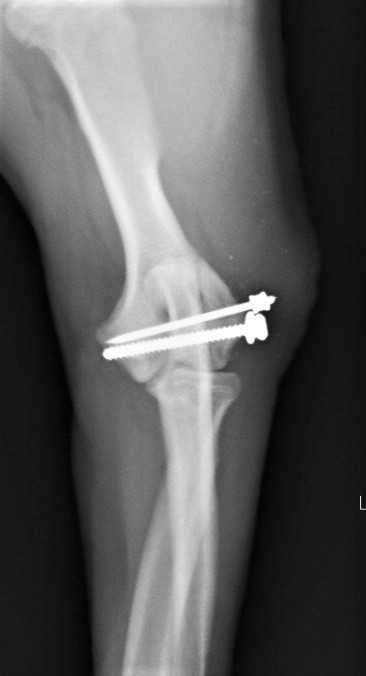 その後数週間で抜いたスクリューとピンの部位の骨増生を認めたため、定期的なX線検査により経過を観察して治療終了としました。