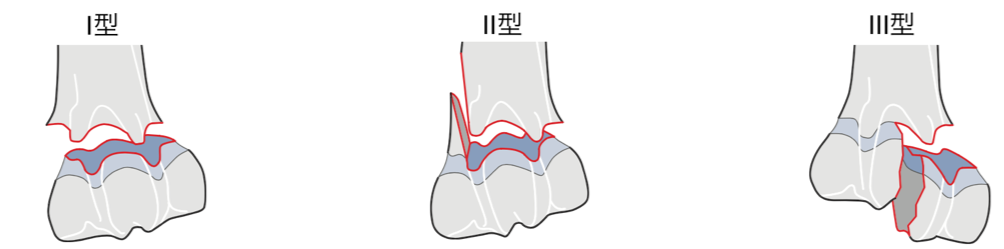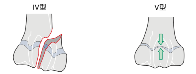 成長板骨折はSalter-Harris分類という分類方法により、下のようにⅠ〜Ⅴ型に分類されます。