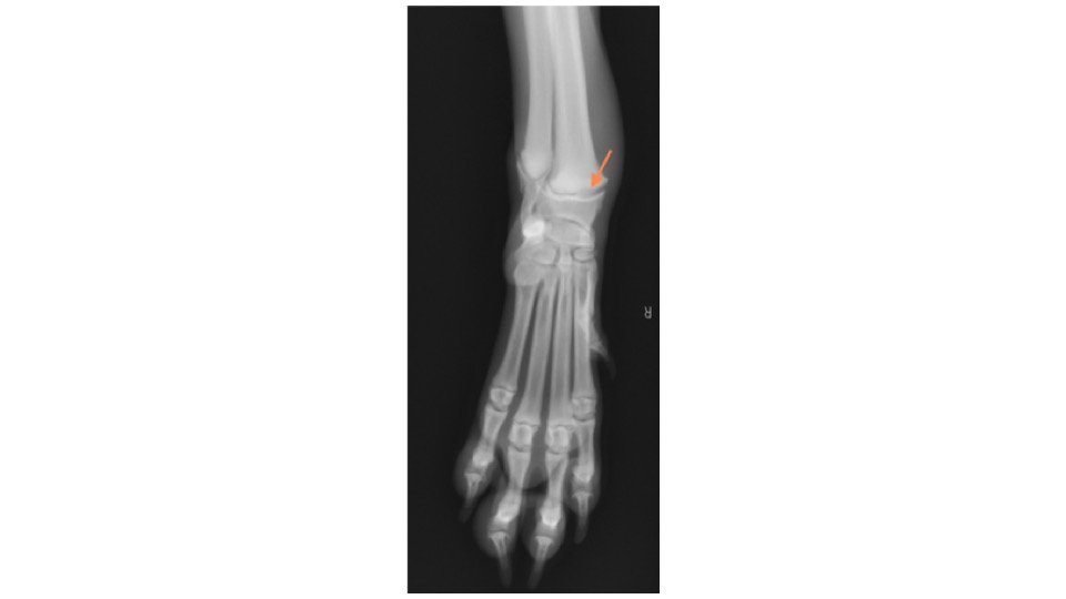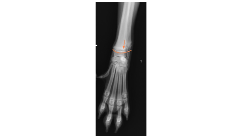 レントゲン検査を行ったところ、右手根骨のⅠ型成長板骨折が認められました。