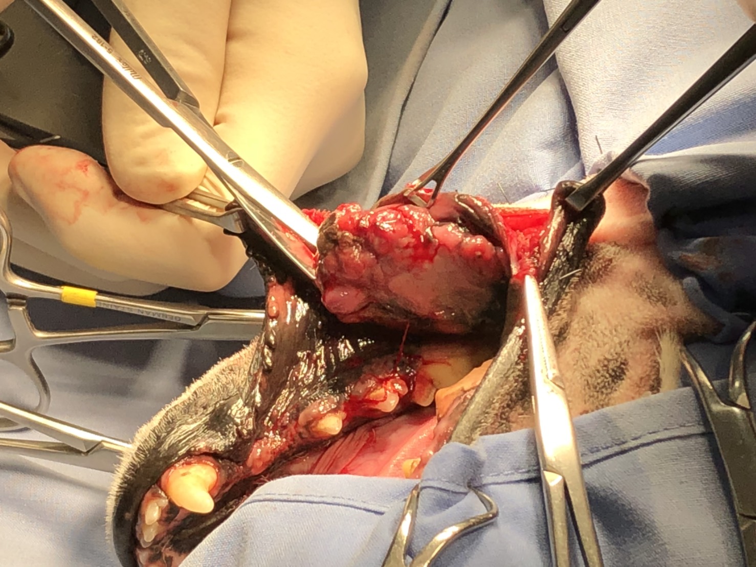 症状として、摂食・飲水障害や顔面の腫大、腫瘤の口腔外への突出などにより気づかれることがほとんどです。転移率は高く、約70%は所属リンパ節に、67%は遠隔部位に転移し、肺野に最も転移します。ただし、局所の制御も重要であり、無治療での生存期間中央値は65日、外科摘出単独での生存期間中央値は150〜318日、1年生存率は35%以下と報告されています。
