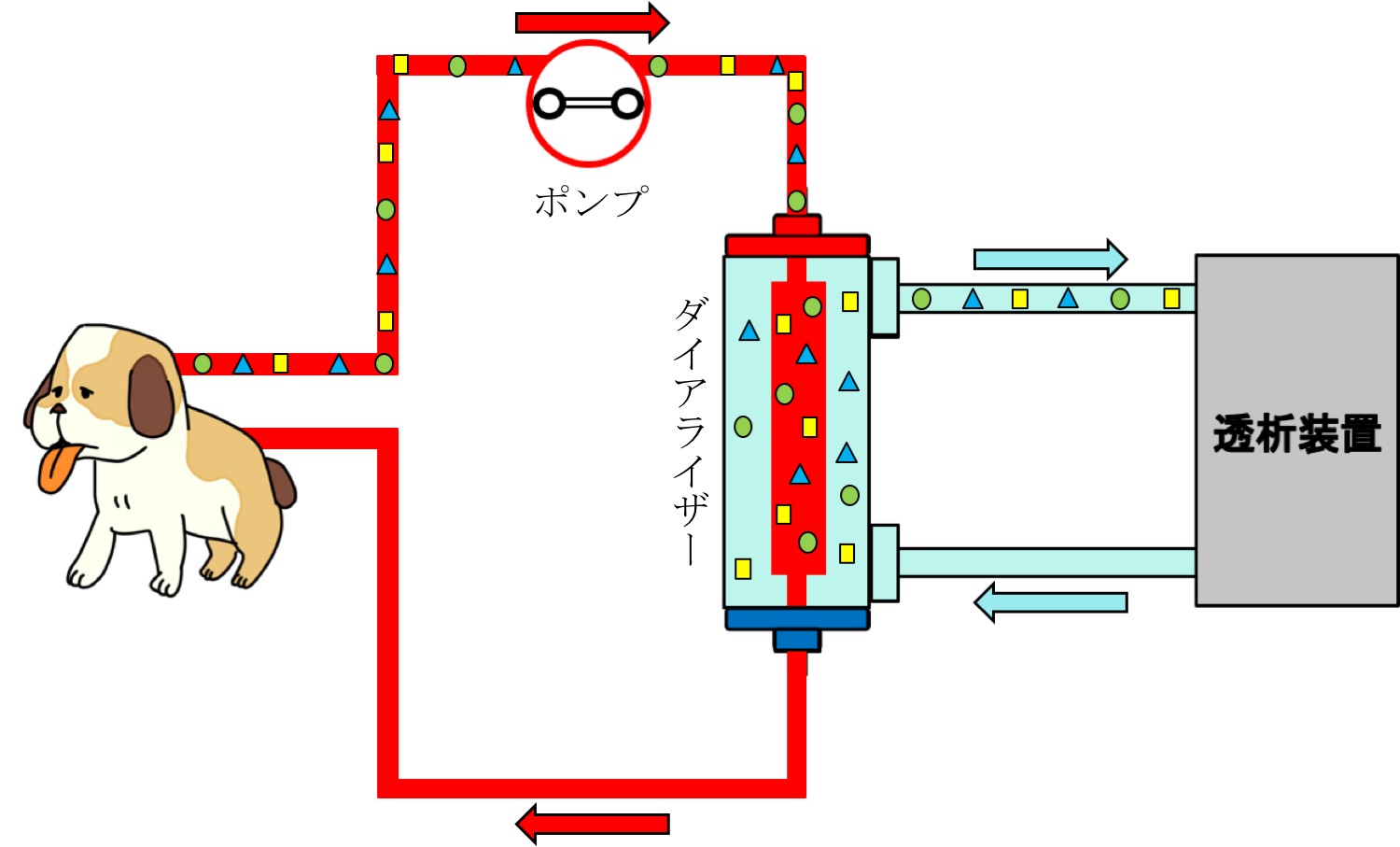 急性腎障害は数時間から数日のうちに急激に腎臓の機能が低下し、尿がほとんど作れなくなる疾患です。原因となる疾患は中毒、腫瘍、結石、感染症、熱中症など様々です。原因疾患を治療しつつ点滴で老廃物の排出や電解質の補正を行うのが一般的ですが、治療に反応がなく尿が作られない場合は血液透析が必要になります。また、慢性腎臓病でも急激な腎障害が出ることがありますので、適応は獣医師とよく相談していただければと思います。